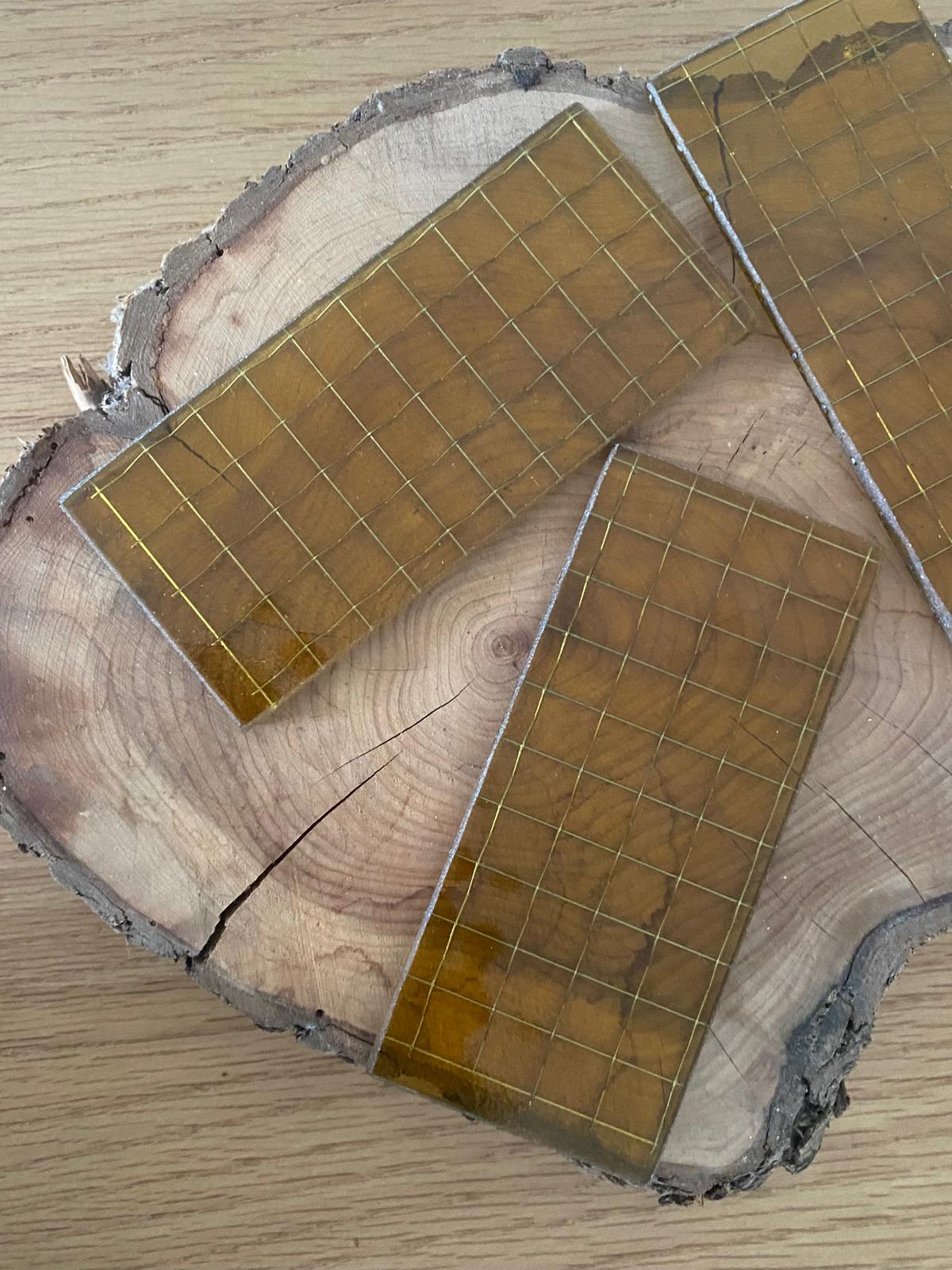 I started by making some sketches to understand how the movement would work and how the light would look as it passed between the slats . Then I experimented with different materials until I found yellow wired glass, which I liked because it filters the light with a warm tone .